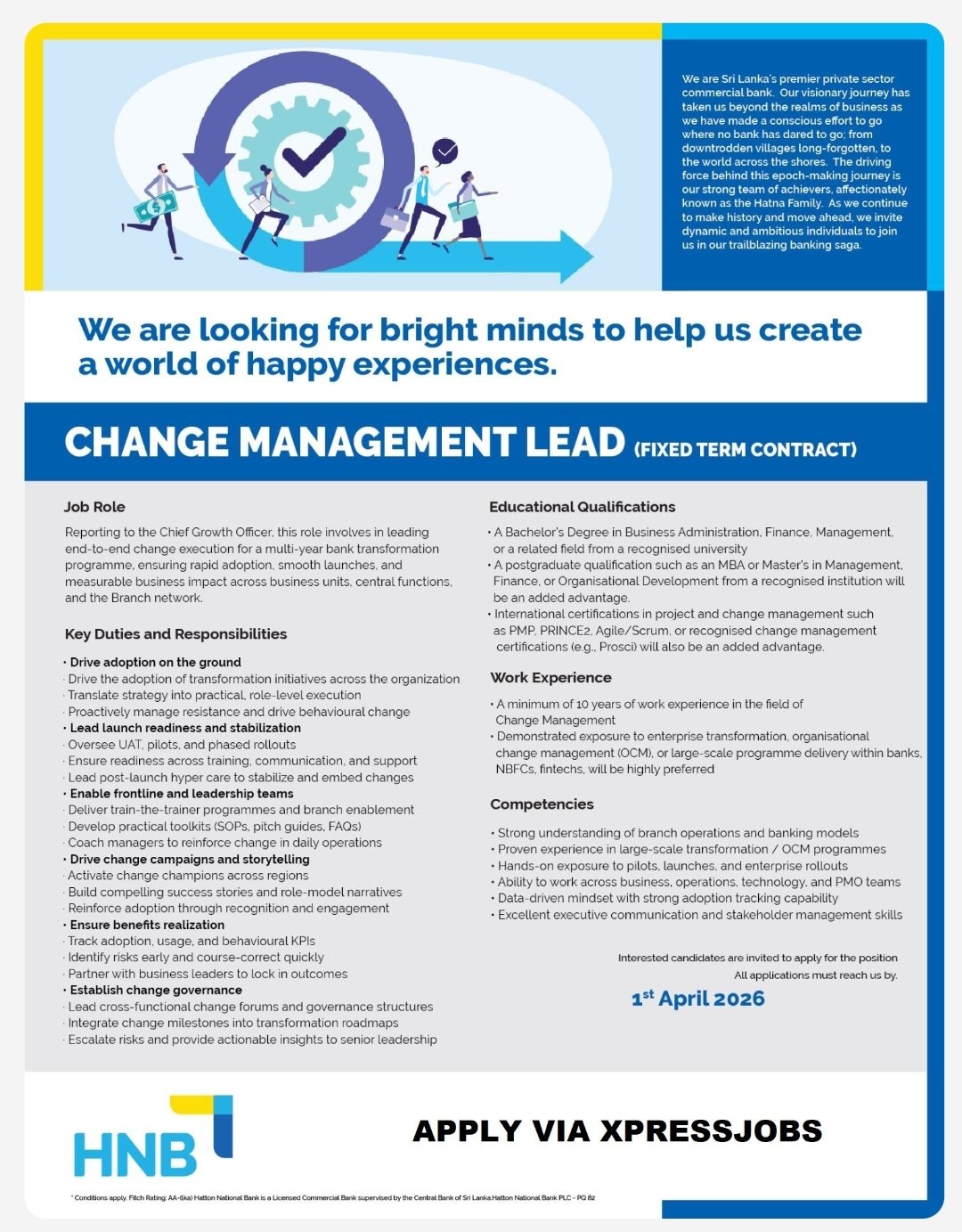 - Digital Leadership: Work with the latest fintech tools like HNB Solo.
