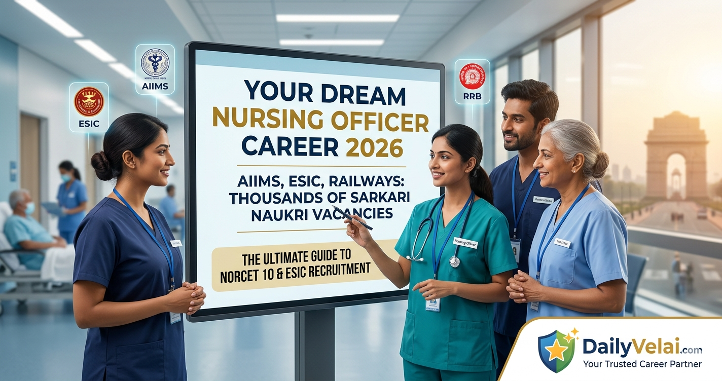 Discover the latest Indian Government Nursing Officer Vacancies for 2026. Complete guide to AIIMS NORCET 10, ESIC, and RRB jobs. Apply now and secure your future with DailyVelai!