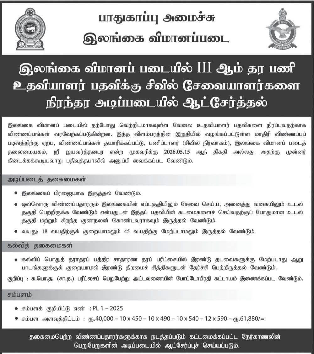 The Ministry of Defense has announced the recruitment of Civilian Staff for the position of Office Assistant (KKS – Grade III) in the Sri Lanka Air Force on a permanent basis.