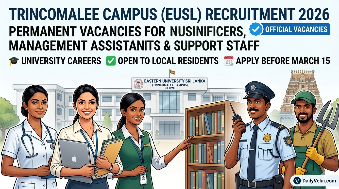The Trincomalee Campus of the Eastern University, Sri Lanka (EUSL), located in the scenic area of Nilaveli, has officially announced recruitment for several Permanent Non-Academic Cadre Posts for the year 2026. This announcement, released on March 01, 2026, serves as a prime opportunity for residents of Trincomalee and the Eastern Province to secure a stable career in the government university system.